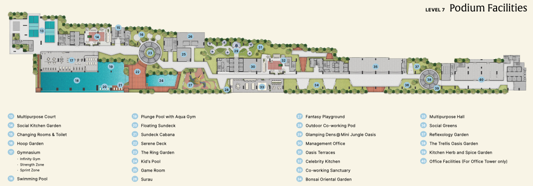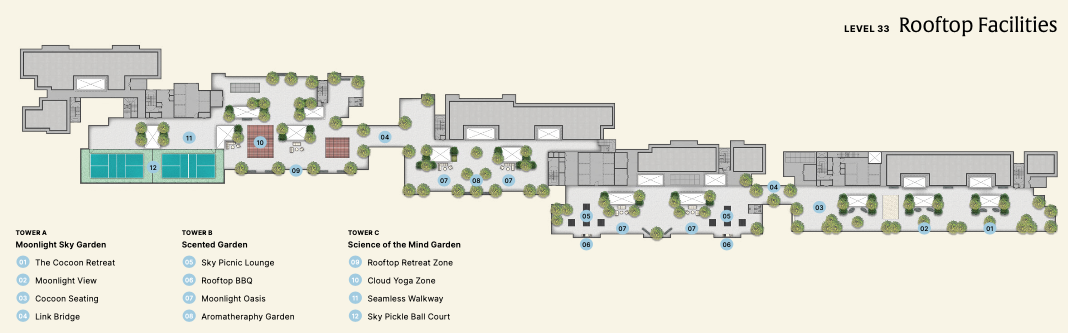 Enjoy a full suite of resort-style facilities including a sky pickleball court, celebrity kitchen, and Olympic-size pool.